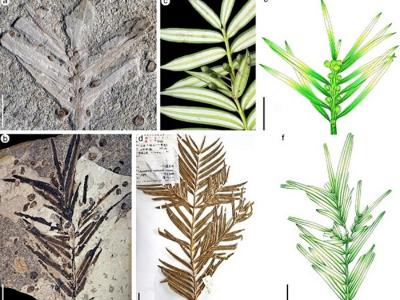 (a,b)中-晚侏罗世道虎沟生物群穗花杉化石; (c,d)现生穗花杉; ...