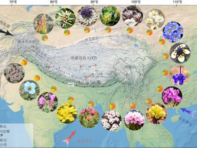 西藏-喜马拉雅-横断山地区地形图。图中照片分别代表了选择的18个类群(顺时针从上到...