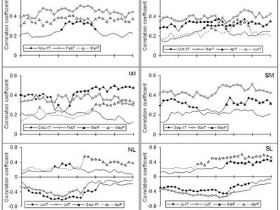 不同海拔上年(-1)与当年气候因素(T, 温度; P, 降雨)与巴山冷杉生长之间关系的2...