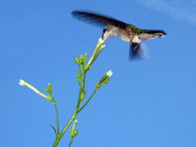 清晨一蜂鸟在吸食Nicotiana attenuata花 烟草植物(Nicotiana attenuata)与每晚...
