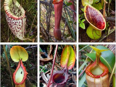 作为本研究的一部分,在马来西亚婆罗洲采样的一些猪笼草物种。请注意底排前两个捕虫...