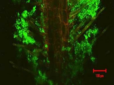 植物受伤后会向根部发出求救信号,根部收到求救信号后会释放有益细菌(图中绿色)...