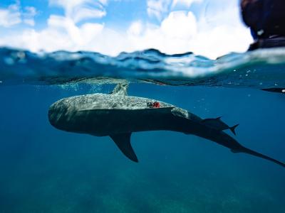 科学家在巴哈马群岛的虎鲨身上安装了配备摄像机的追踪器,以估算海草床的范围。图片...