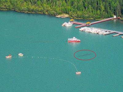 一位当地渔民指出湖中有人失踪的位置 当地人称在俄罗斯西伯利亚地区的钱尼湖...