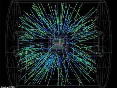 一个质子与铅的原子核发生撞击,Alice探测器中产生一个粒子群。 在大型强子对...