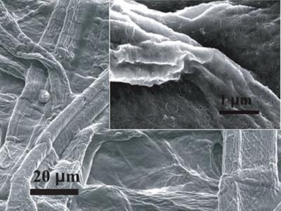 对未曾覆盖的纸纤维的电子显微扫描图像(大图)以及涂上一根碳纳米管后的纤维图像...