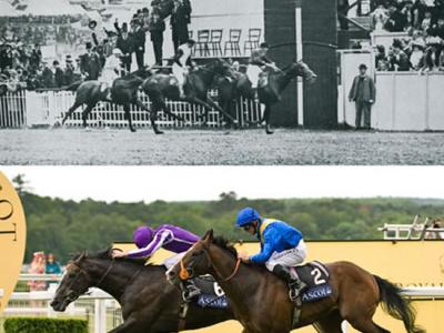 1900年(上图)与2009年的照片显现了职业赛马骑师在骑乘姿势上的变化。 1897年,...