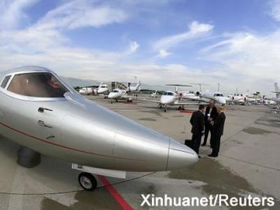 5月11日,在瑞士日内瓦举行的第九届欧洲公务航空会展上,参观者观摩露天展出的各...