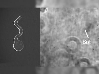“微型推进器”状似蝌蚪,可进入眼球。团队在死猪眼球上测试。...