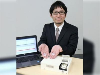 筒井真楠展示他团队开发的检测装置。流感患者的飞沫含有病毒。...