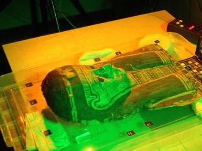 研究人员以红外线技术,扫描木乃伊的棺木。研究人员扫描到纸莎...