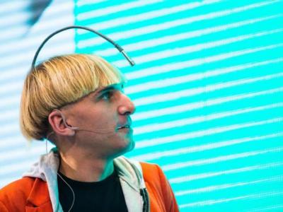 艺术家尼尔.哈比森(Neil Harbisson)头戴的天线装...