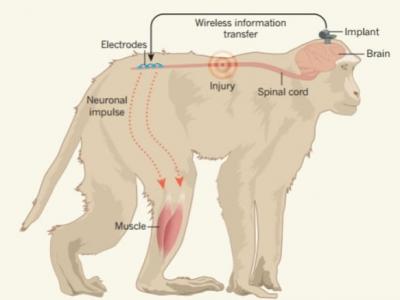 瘫痪猴子植入装置后可以行走的图解。 科学家把一具脑部植入装置放在矽胶模型上...