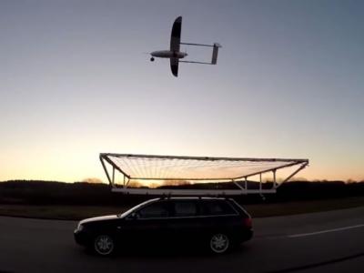 无人机在汽车上方低飞 无人机进一步靠近车顶的接收网。 成功降落,无人机丝...