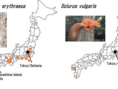 日本两种非本土松鼠的分布:日本松鼠(Callosciurus erythraeus左)和欧亚红松鼠(Sciu...