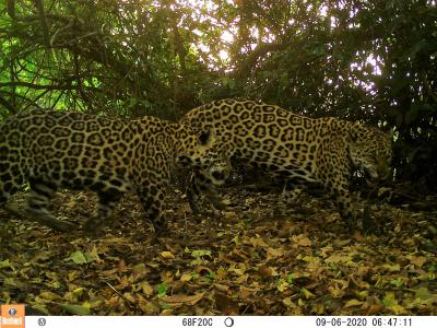 两只美洲虎,用相机陷阱调查捕捉到,走过巴西亚马逊雨林。Credit: Daniel Rocha/UC...
