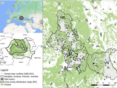 2008-2016年,罗马尼亚东喀尔巴阡山脉记录的熊捕食事件分布。学分:保护科学与实践...
