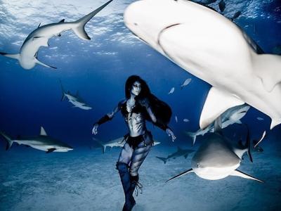 英国女模特到巴哈马的大西洋海域与虎鲨翩