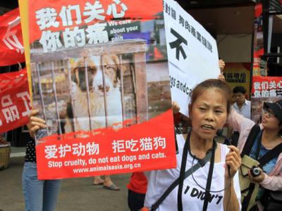 动物义工举牌反对举办「狗肉节」(CFP) (蜘蛛网报道)据ETtoday:广西玉林「夏...