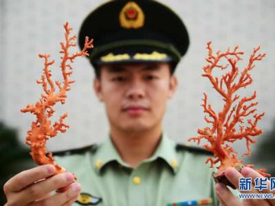 6月9日,在福建省宁德市边防支队营区,民警展示查获的红珊瑚。 6月9日,在福建...