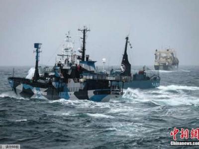 日本捕鲸船“第二勇新丸”(Yushin Maru)号企图驱赶反捕鲸船“史蒂夫·欧文”(...