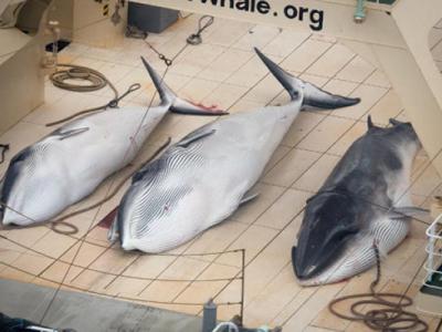 图为三条被捕杀的小须鲸,在日本捕鲸船的甲板上。 反捕鲸团体航拍的照片显示,...