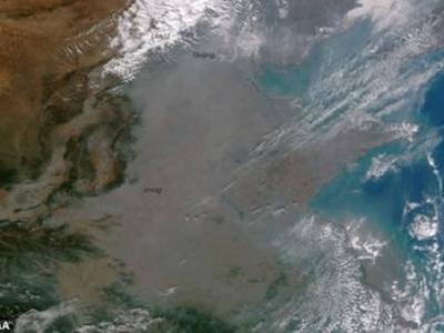 美国宇航局Suomi NPP卫星最新图像显示中国北方地区上空严重的空气污染,这可能是...