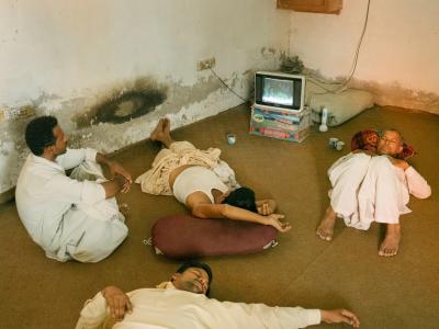 巴基斯坦贾卡伯(Jacabob)的米仓工人,在天正热的时候稍事休息。不断上升的夜晚温...