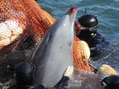 穿着潜水服的人在被困于一处浅湾中的海豚之间穿梭,他们的手指仔细地掠过每只海豚...