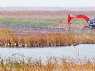 南汇东滩湿地,一群白鹭在芦苇下歇息捕食,远处一台挖掘机在开垦湿地。 上世纪末...