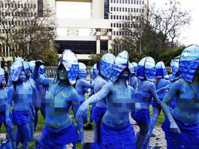 环保组织成员戴鱼形头罩游行为鱼类“请命”