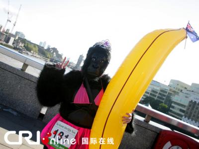 英国伦敦身着猩猩服装的人们长跑为大猩猩