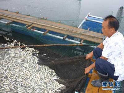 养殖户蹲在网箱上打捞已死亡的鱼苗 连日来,资江湖南新邵段自上游至下游约百余里...