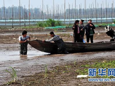6月1日,离留守人员居住地数十米时,机动船再也不能前进,留守人员只能推着更小的...