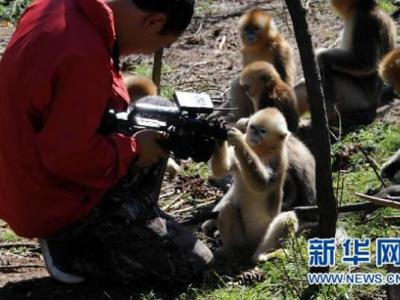2010年9月17日,在神农架金丝猴保护研究中心大龙潭基地,一只金丝猴在观看媒体记...