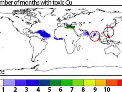 有颜色的区域代表了有毒铜沉积的热点地区——蓝色表示有毒环境会持续3到4个月,绿...