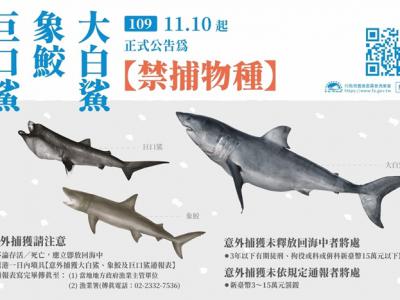巨口鲨、大白鲨、象鲛正式禁捕,渔业署提醒渔民,若意外捕获务必放回海里并填写通报...