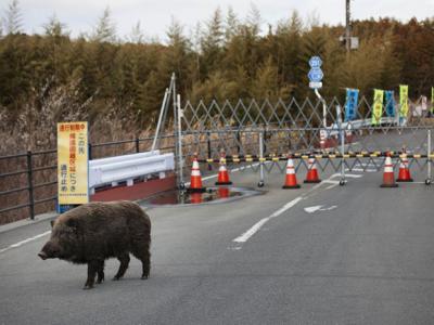 在福岛第一核电厂周遭空荡荡的隔离区里,一头野猪漫步在路上,...