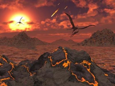 在让非飞行恐龙灭亡的大灭绝事件发生时,几只翼龙飞过火山的想象图。 ILLUSTRATION...