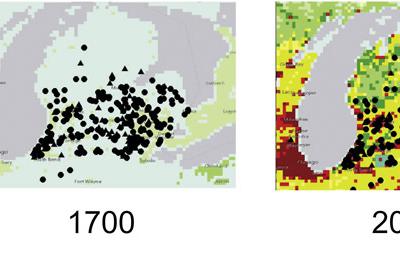1700年和2000年,密歇根普列斯特世的活动场所。三角形是长毛象,圆圈是乳齿象的地方...