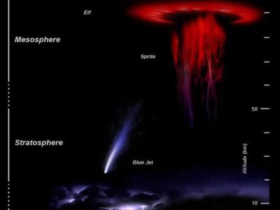 闪电为暴风云上方高处的伽玛射线闪光和紫