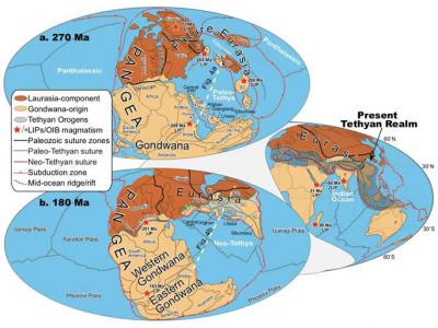 特提斯洋的大洋板片向欧亚大陆的俯冲作用是驱动陆块漂移的“引擎”(CREDIT:Science...
