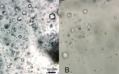 奥陶纪石盐中的原生(左)与次生流体包裹体(右)(蜘蛛网eeo...