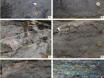 野外照片,(A)和(B)分别是红花园组的微生物岩和...