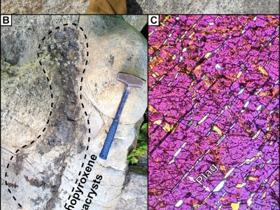 露头和薄片中的斜长石和淡色辉长岩。(A) Marcy露头(Wolfjaw Mountain)在斜长岩...