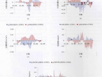降水(a)、蒸发(b)、表层土壤湿度(c)、径流(d)和雪水当量(e)变化(敏感试验—控制试...