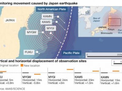 日本大地震前后各测量站位移情况 据英国媒体报道,根据设置在海床上的仪器实测数...