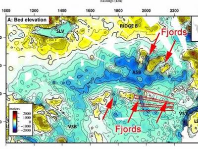 这张南极大陆东部冰盖下的地形图上显示出几处大型的峡湾地貌,这是大约3400万年前...