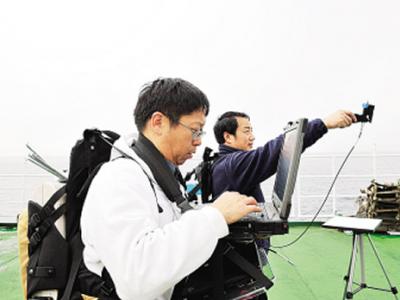 7月12日,美国得克萨斯大学的谢红接(前)和南京大学的柯长青(后)在“雪龙”号...