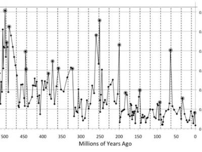 图表中带有圆圈的峰尖表示生物大灭绝,而带点线则表示每2700万年。 科学家研...